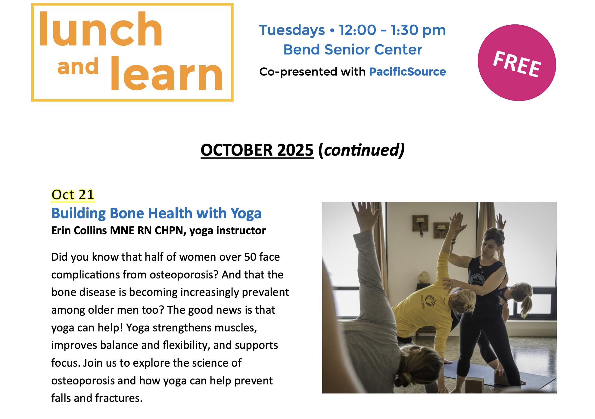 Join me at Larkspur Community Center for this Lunch and Learn preview of an upcoming January Series on Yoga for Bone Health. This event is a talk with a small amount of seated yoga as example. No Charge.